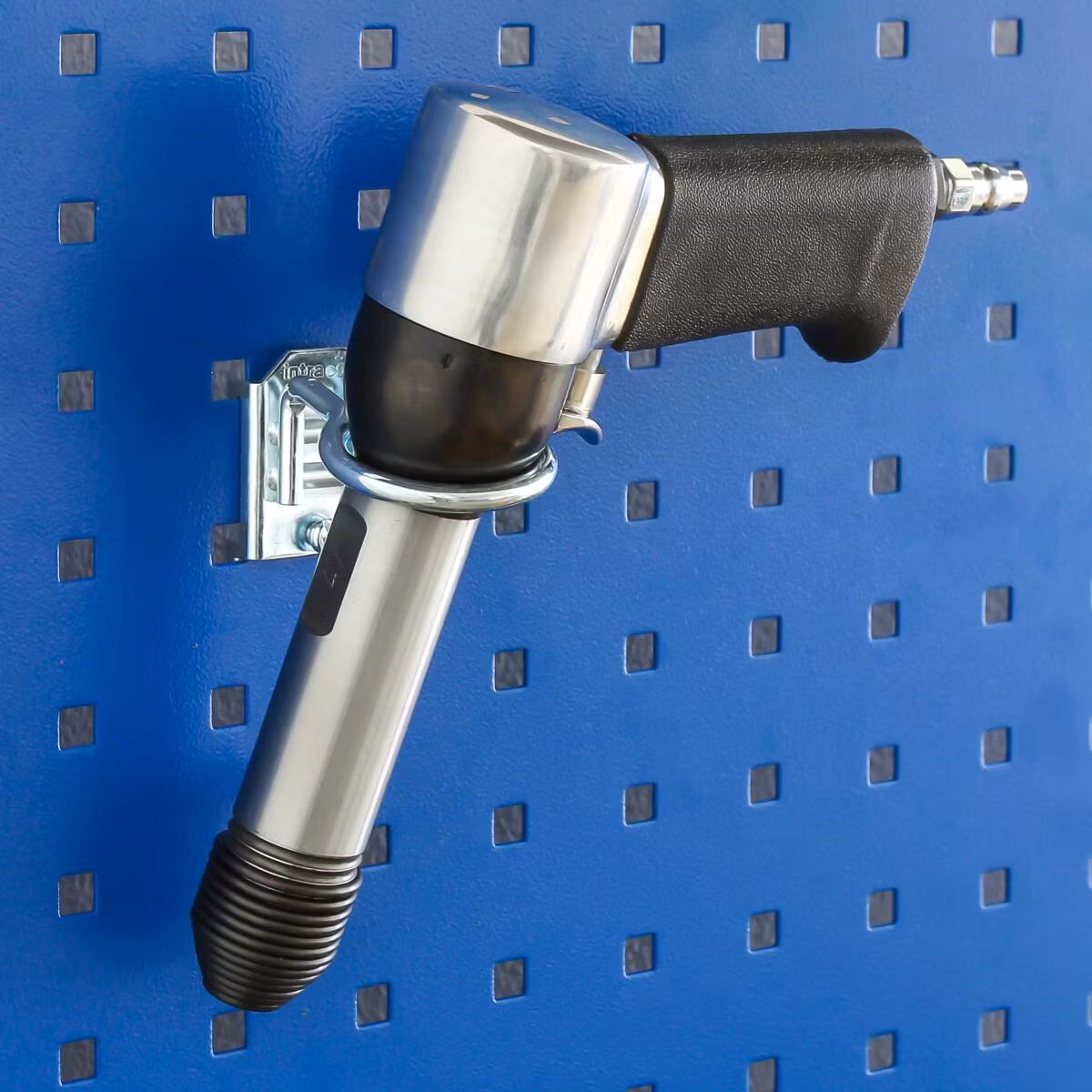 Ringkrok. Förzinkad. Kroken passar perforerade paneler, där den hakas i plåtens perforering och låses med stoppskruv.