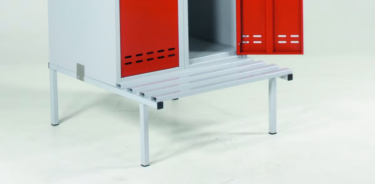 Ram med bänk och ben för montering under klädskåp, ger en effektiv avlastnings- och sittyta i omklädningsrummet. Ramen skapar även förvaringsutrymme under klädskåpen och underlättar städning.