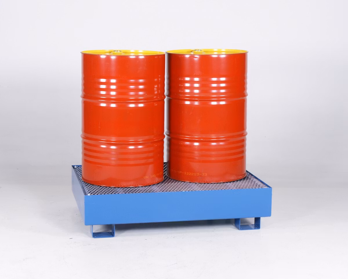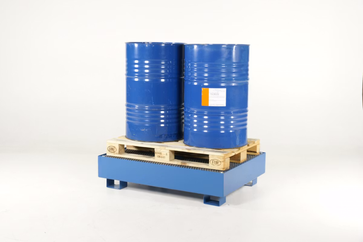 Fatpall för två stående fat. Hanteras med handtruck, staplare eller gaffeltruck.