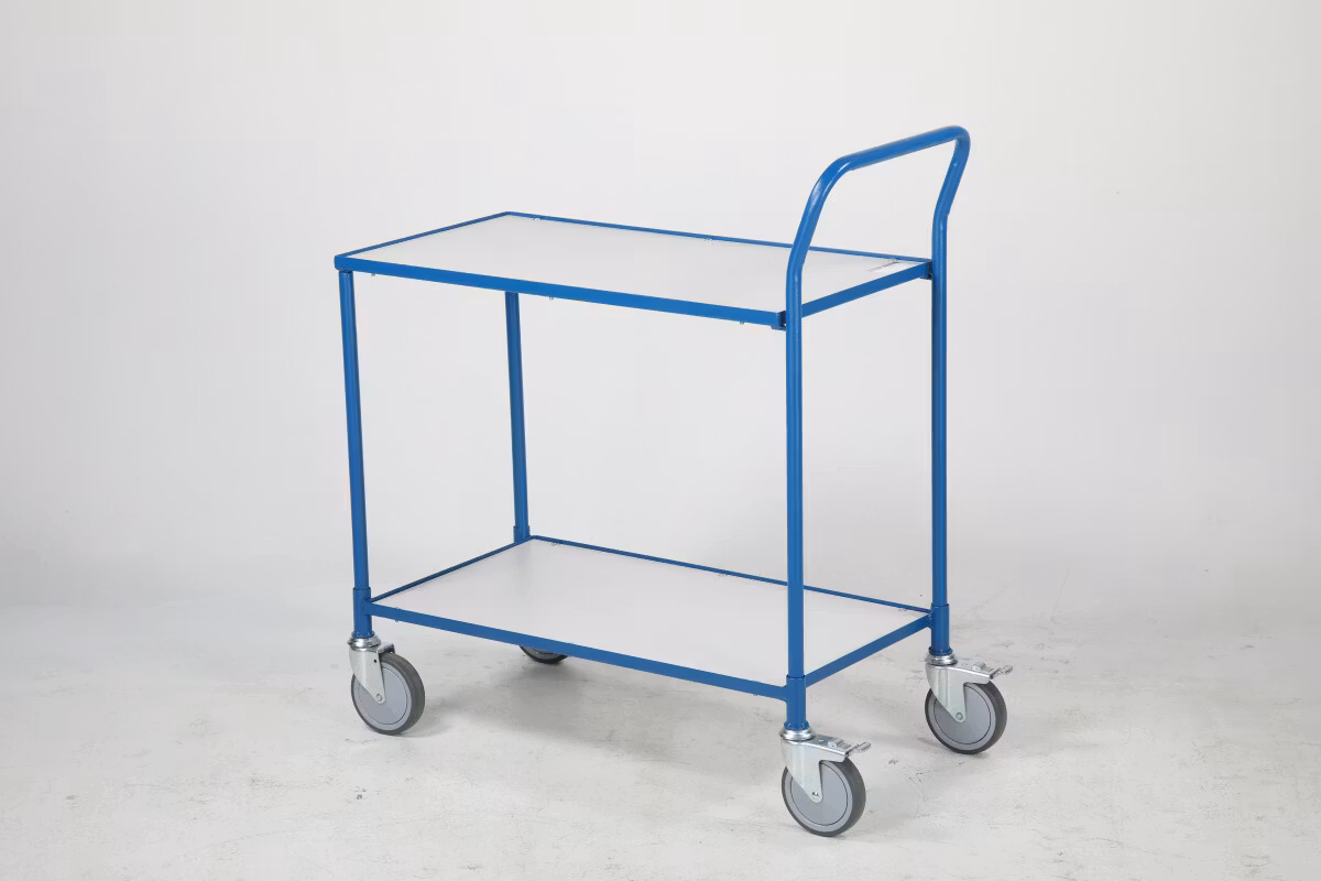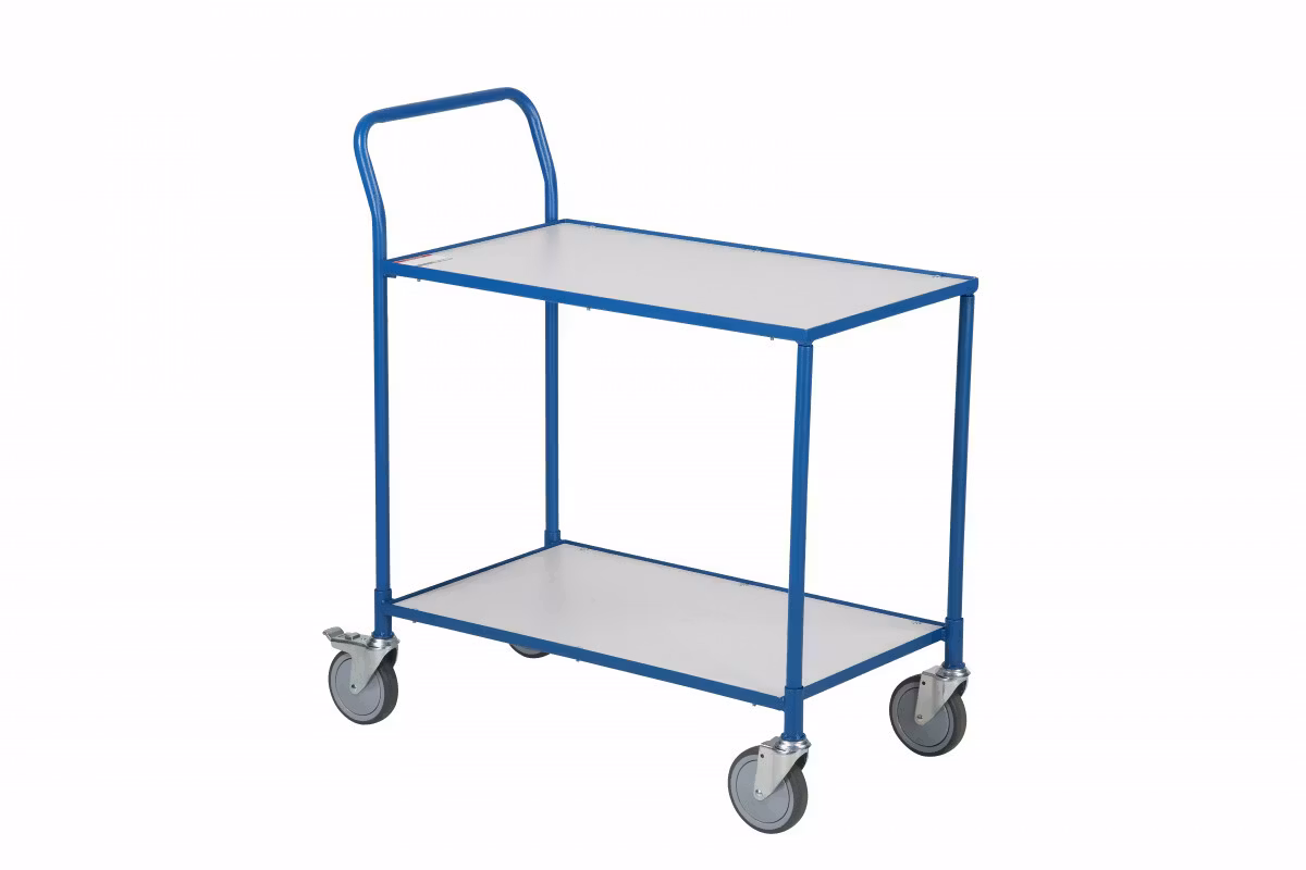 Bordsvagn med 2 styck hyllplan. Kraftigt stålstativ och 10 mm limmad laminatskiva. Kapacitet 150 kg jämnt fördelat per vagn (75 kg per hyllplan). Levereras omon